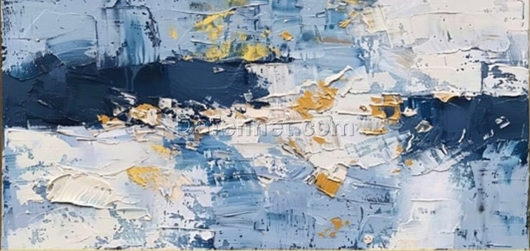 Abstract Oil Painting with Blue and Gray-White Background – Yellow Accent Art for Living Room and Dining Room Walls
