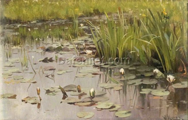 Authentic – looking ‘Walter Moras Inspired’ Oil Painting of ‘Uferpartie mit Teichrosen’ on Cardboard, Hand – crafted in Dafen Village for Collectors of German Lakeside – Themed Art