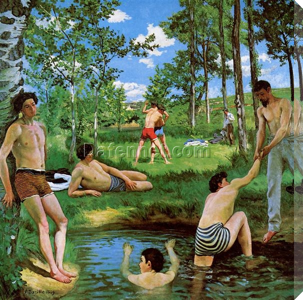 Celebrate the beauty of French Impressionism with “Bathers (Summer Scene)” by Frederic Bazille (1869). This masterpiece portrays a group of bathers enjoying a warm summer day along the Lez River near Montpellier. With its luminous colors, natural light, and relaxed figures, the painting reflects Bazille’s skill in blending landscape and human form—an iconic work in the early Impressionist movement.