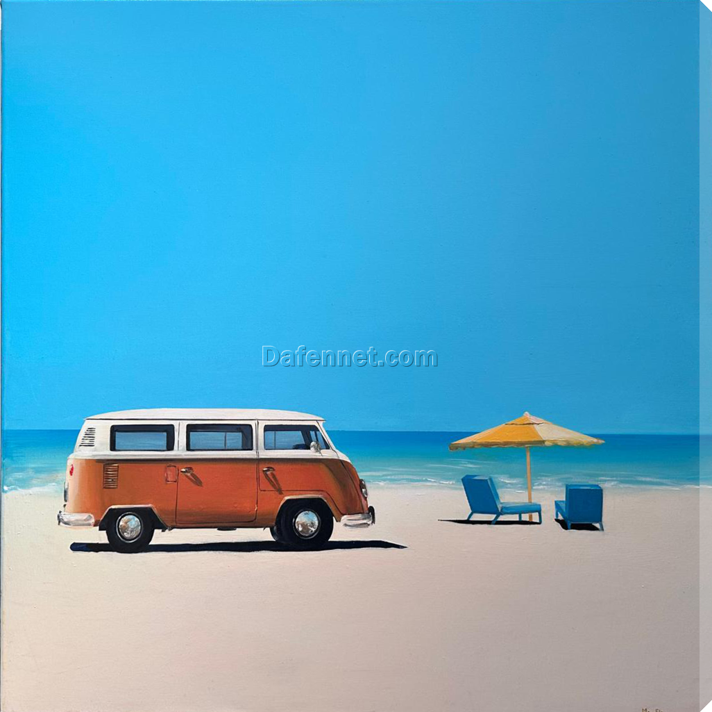 Escape into the calm of summer with this serene oil painting, “Beach Van and Umbrella.”