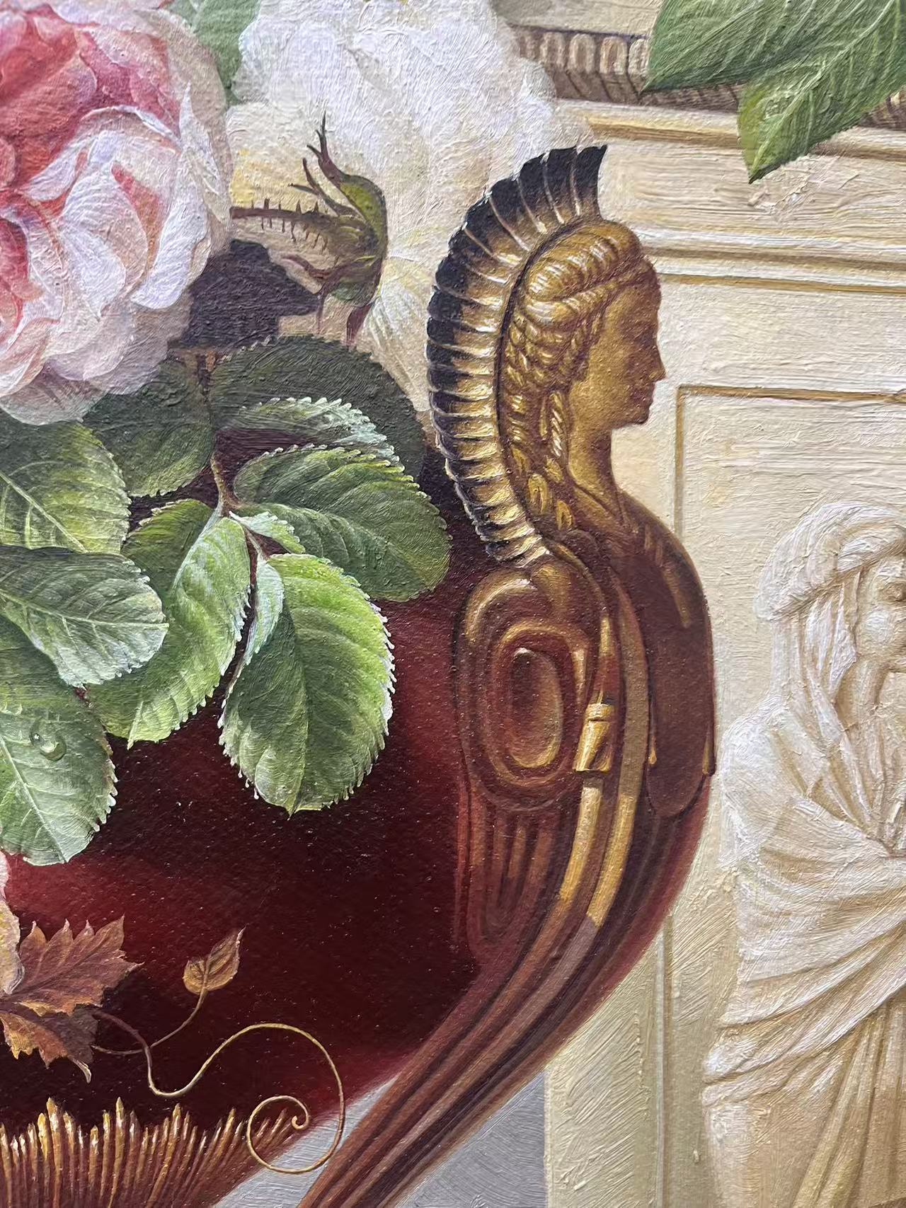 From the first sketch to the final high-shine highlights, we worked step by step, respecting the structure of the original while letting the painting feel fresh and alive. The result is a museum-style floral still life oil painting, full of detail when you stand close, and full of harmony when you step back.