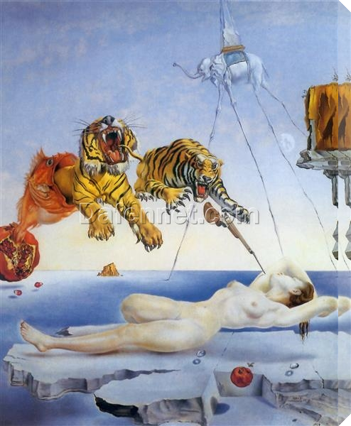 Dream Caused by the Flight of a Bee around a Pomegranate a Second before Awakening (1944) is one of Salvador Dali’s most iconic surrealist paintings. This symbolic oil on canvas piece beautifully captures the dreamlike fusion of reality and fantasy, characteristic of Dali’s Classic Period. The work explores the subconscious mind, evoking themes of transformation and awakening through vivid imagery of a bee, pomegranate, and dream symbolism.