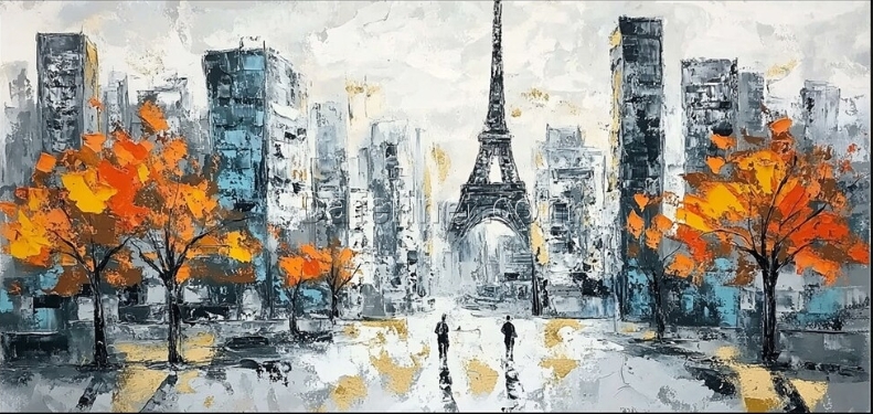 Eiffel Tower Cityscape Oil Painting – Morning Textures and Layered Abstract Art for Stylish Entryway