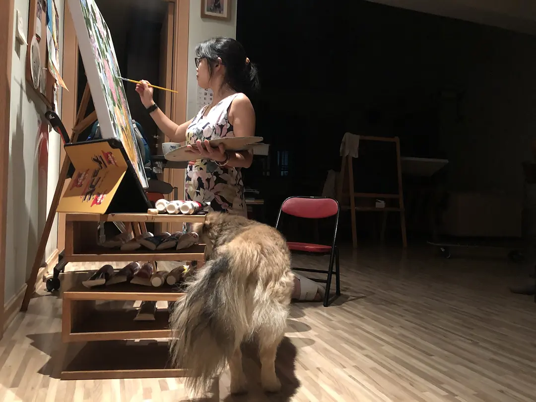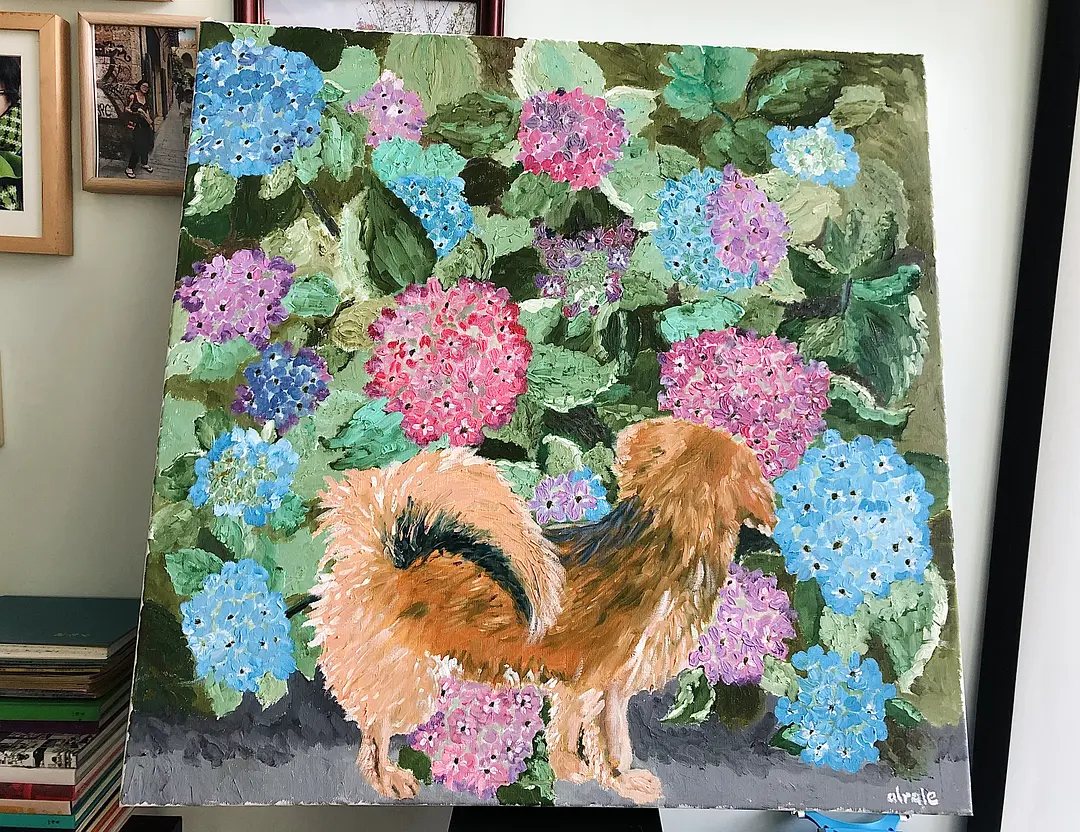 I look at these hydrangeas every day when I take my dog for a walk, and one day I decided I should paint them. That became my first painting: “Dog and Hydrangeas.” I used bright reds, purples, and blues for the blossoms, with olive green and cobalt blue for the leaves. When I looked at it, I felt like I had somehow expressed my inner world.