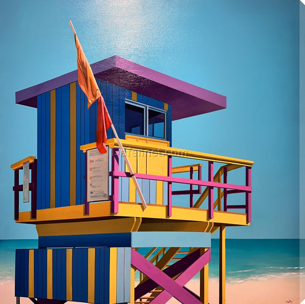 “Lifeguard Tower by the Sea” – Modern Coastal Oil Painting on Canvas | Colorful Beach Architecture Wall Art | Hand-Painted by DaFen Village Artists