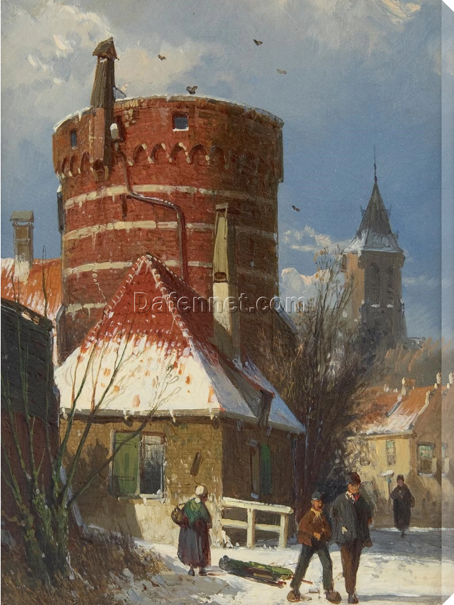 Willem Koekkoek “Dutch Street with Old Fortress Tower in Snow” Hand-Painted Oil Painting | Dafen Village Studio Museum Quality Reproduction